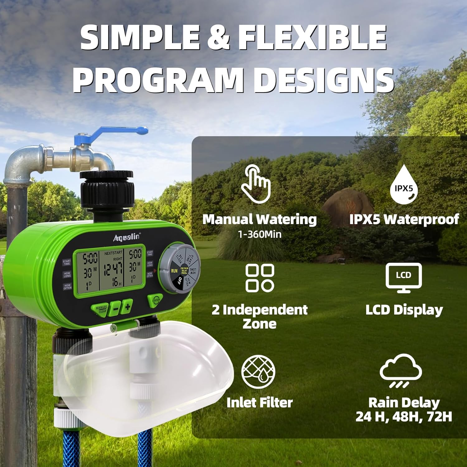 Stellen Sie sich vor, Sie kommen nach einem langen Tag nach Hause und Ihr Garten erstrahlt in sattem Grün, ohne dass Sie einen Finger rühren mussten. Der Aqualin Bewässerungscomputer mit zwei unabhängigen Ausgängen verwandelt diese Vision in Realität. Als Premium-Lösung für anspruchsvolle Gärtner bietet dieses Gerät nicht nur präzise Automatisierung, sondern schafft echte Freiheit: Zeit für Familie, Entspannung und gemeinsame Momente im Freien, während Ihre Pflanzen optimal versorgt werden. Entwickelt von Aqualin, einem Marktführer in der Gartentechnik, kombiniert es innovative Technologie mit robuster Handwerkskunst, um Ihren Alltag zu erleichtern.