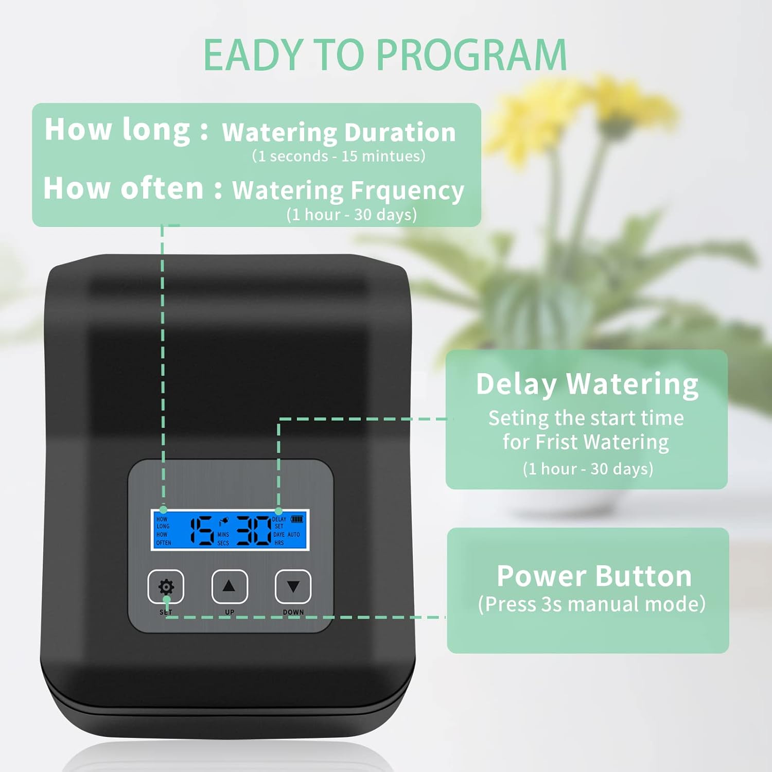 Small device but very useful. When I go on vacations for long time I will not have to worry to water my plants, one can set after how many hours, days water should be given and how many seconds. Device can be used with electricity and also with batteries. Very useful device and I am happy with it.