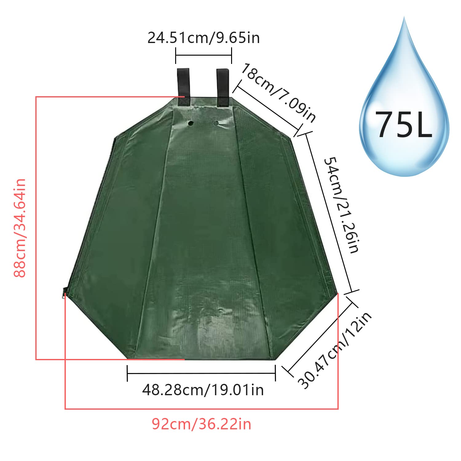 Le dimensioni del sacco sono ideali per la maggior parte degli alberi giovani: con una capacità di 75 litri, è abbastanza grande da fornire un’adeguata quantità d’acqua per mantenere il terreno umido per diversi giorni. Il sacco misura circa 85 cm di altezza e ha un diametro sufficiente per avvolgere comodamente il tronco dell’albero.