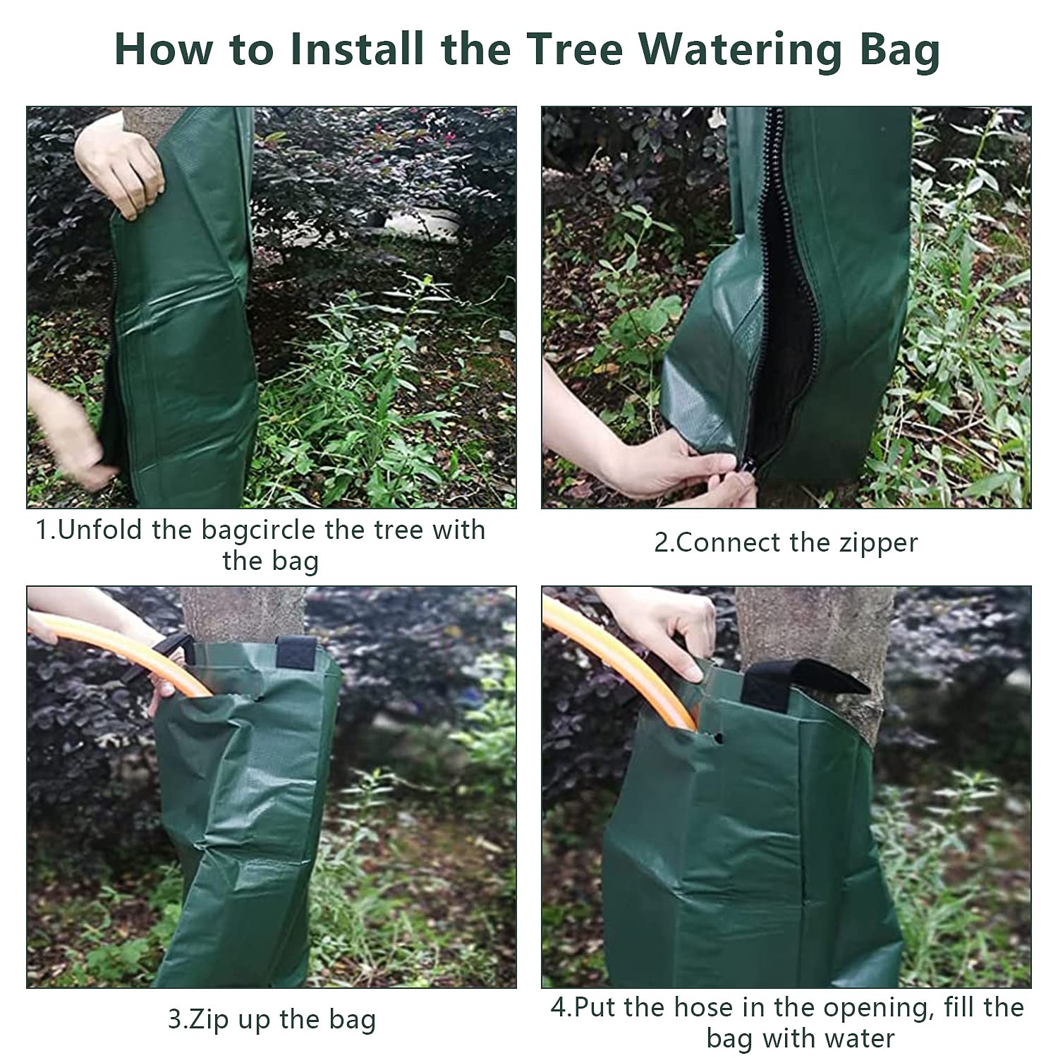 Le principe est simple: on met la poche autour de l’arbre et on referme la fermeture éclair. On place un tuyau dans le haut de la poche et on remplit d’eau. L’eau coule tout en douceur des parties poreuses pour conserver le sol tout le temps humidifié et garde le tronc frais.