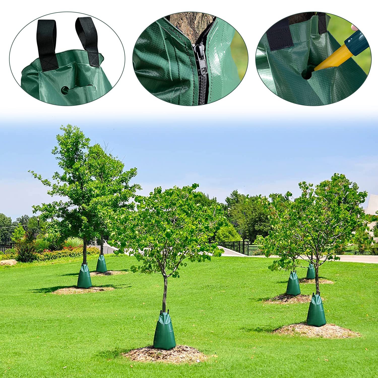 Il principio di funzionamento è semplice: si mette il sacco intorno all’albero e si chiude con la cerniera. Poi si inserisce un tubo nella parte superiore del sacco e lo si riempie d’acqua. L’acqua scorre lentamente dalle parti porose del sacco, mantenendo il terreno umido per un lungo periodo. Questo non solo assicura una corretta idratazione delle radici, ma aiuta anche a mantenere fresco il tronco dell’albero, proteggendolo dai danni causati dal calore. Inoltre, offre una buona protezione contro figli animali