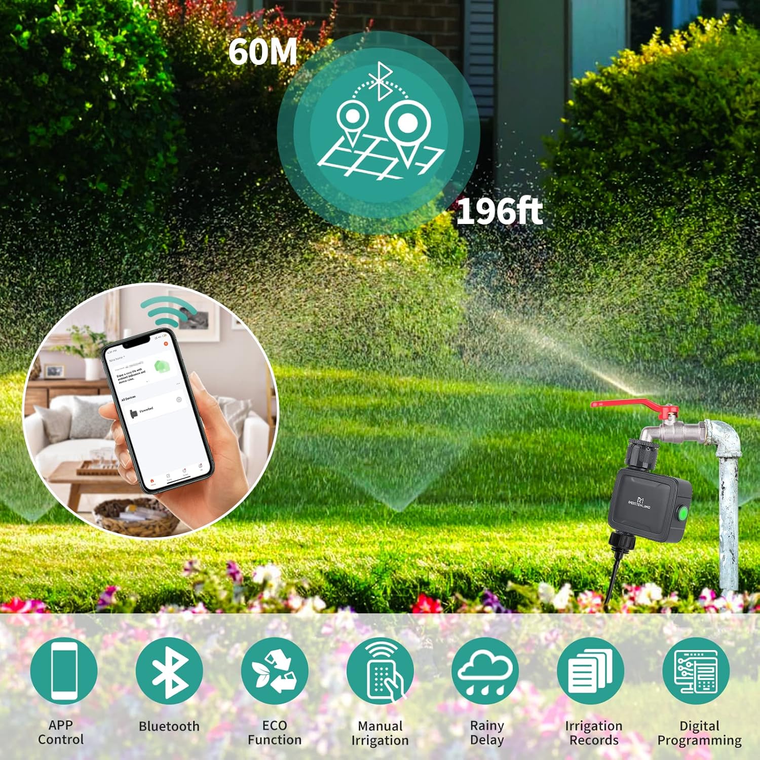 Die Bluetooth-Verbindung erlaubt drahtlose Anpassungen bis zu 10 Metern, was die Positionierung flexibel macht – montieren Sie es am Schlauchanschluss oder zentral im Garten. Für unterschiedliche Systeme, von Sprinklern bis zu Tropfleitungen, bietet es modulare Einstellungen, die den Wasserfluss optimieren.