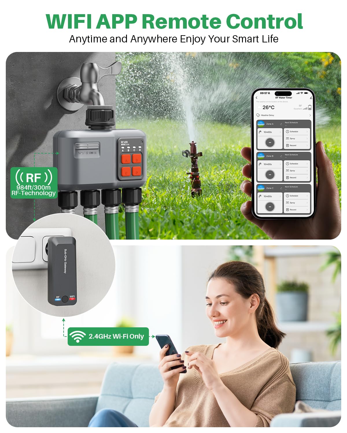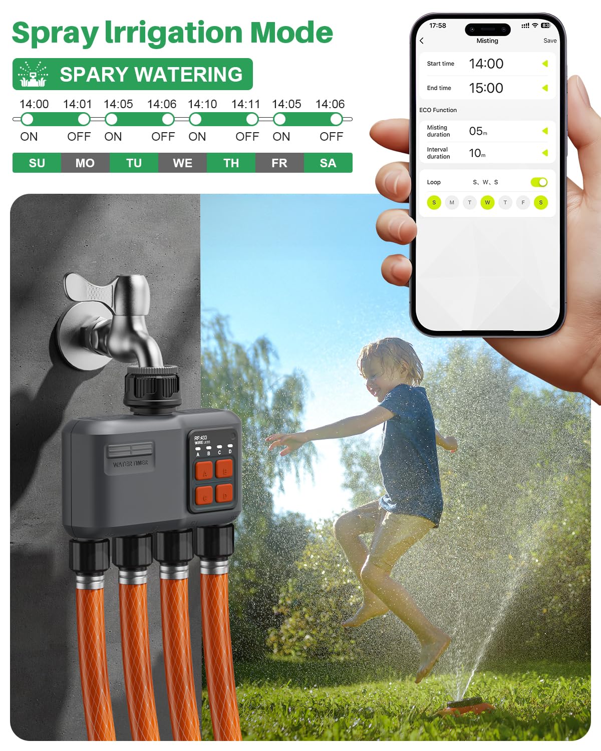• Flexible Modi: Wählen Sie zwischen „Bewässern“ und „Sprühen“ mit bis zu 5 Plänen plus 1 Sprühplan.