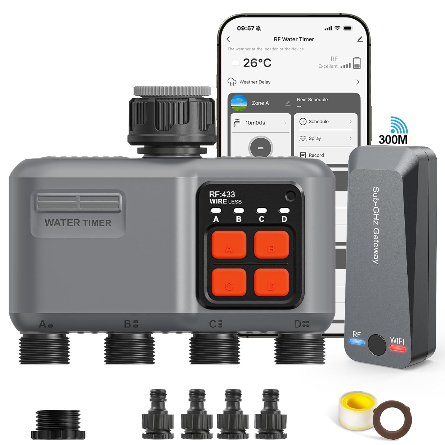 Technisch detailliert integriert das Gerät eine Batterieversorgung, die für konstante Leistung sorgt, ohne externe Stromquellen zu benötigen. Die vier Ausgänge sind mit hochwertigen Ventilen ausgestattet, die korrosionsfrei bleiben, selbst bei Kontakt mit hartem Wasser. Stellen Sie sich vor, wie Ihr Timer Jahr für Jahr im Garten steht, unbeeindruckt von Regen oder Sonne, und so die emotionale Bindung zu Ihrem Zuhause stärkt – ein stummer Wächter, der den familiären Grünraum schützt. Die Präzision in der Verarbeitung, vom präzisen Schließen der Ventile bis zur nahtlosen RF-Integration, unterstreicht die Premium-Qualität: Jede Komponente ist intentional gewählt, um Zuverlässigkeit zu gewährleisten und tägliche Sorgen zu minimieren.