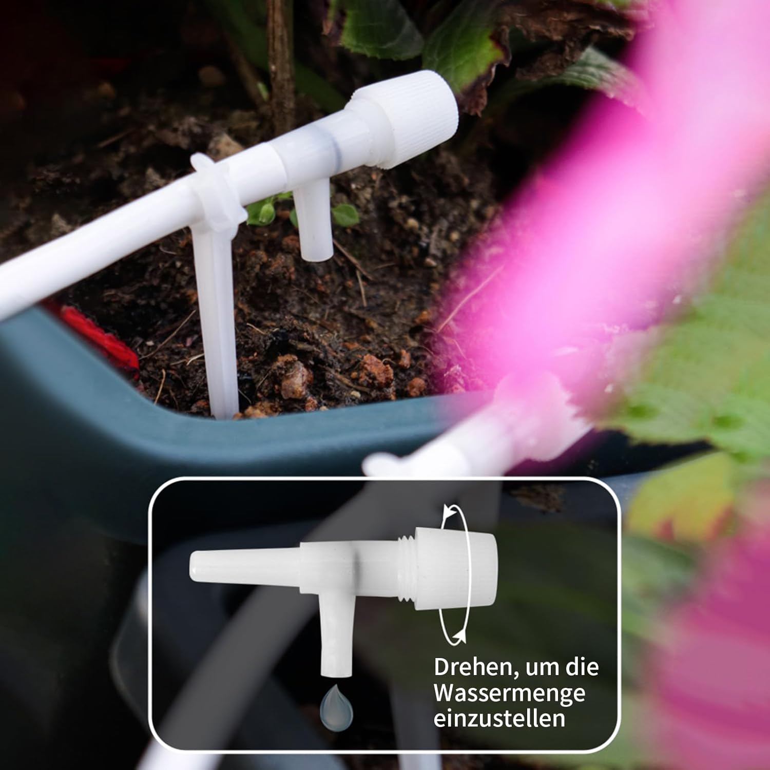 Die Flexibilität des Systems erlaubt Anpassungen an verschiedene Setups, von einzelnen Töpfen bis zu ausgedehnten Anlagen. Mit 16 Tees und Brackets konfigurieren Sie Verzweigungen mühelos, um mehrere Zonen zu bedienen. Die Saugnäpfe und Haken ermöglichen platzsparende Montage an Fenstern oder Zäunen.