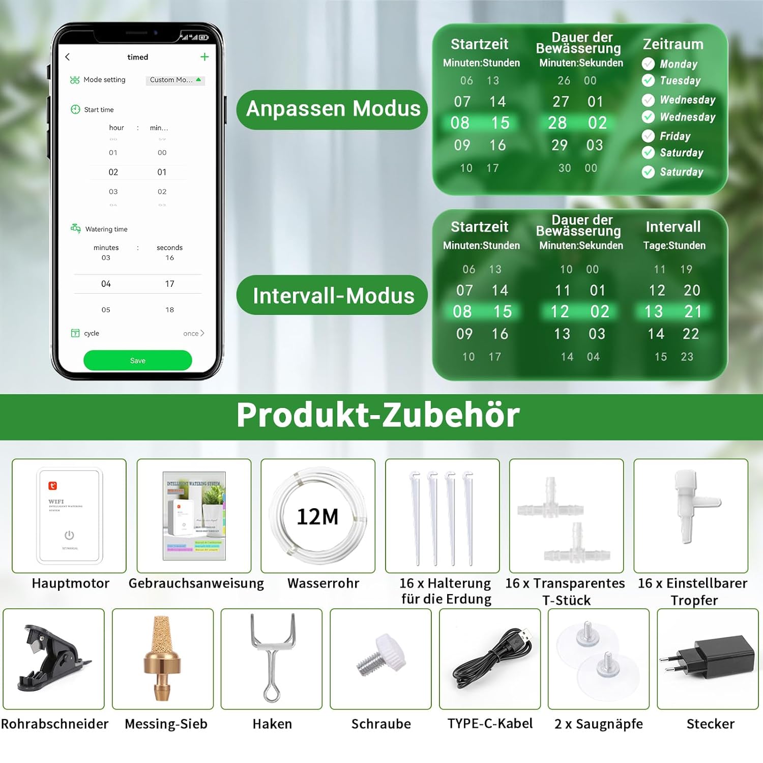 • Zwei Bewässerungsmodi: Individuell anpassbar oder Intervall mit Startzeit, Dauer und Zyklen.