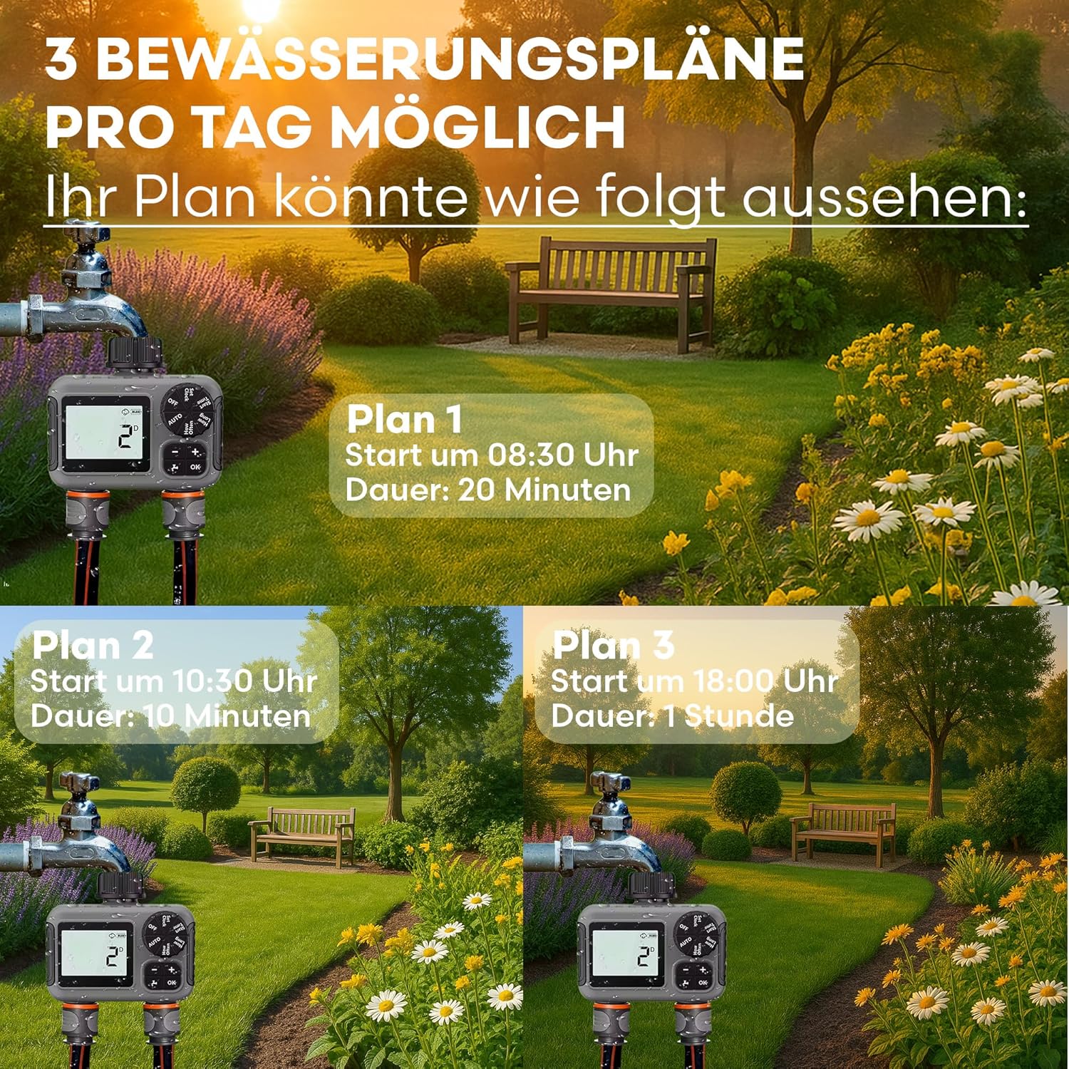 Die Speicherfunktion behält Daten auch bei Stromausfällen bei, was Stabilität in unvorhersehbaren Momenten gewährleistet. Stellen Sie sich vor, wie der Timer nach einem Gewitter nahtlos fortfährt und den Garten schützt – ein Segen für Eltern, die auf Routine bauen. Diese Kapazität ist intentional, um Planungssicherheit zu schaffen und emotionale Ruhe zu spenden.