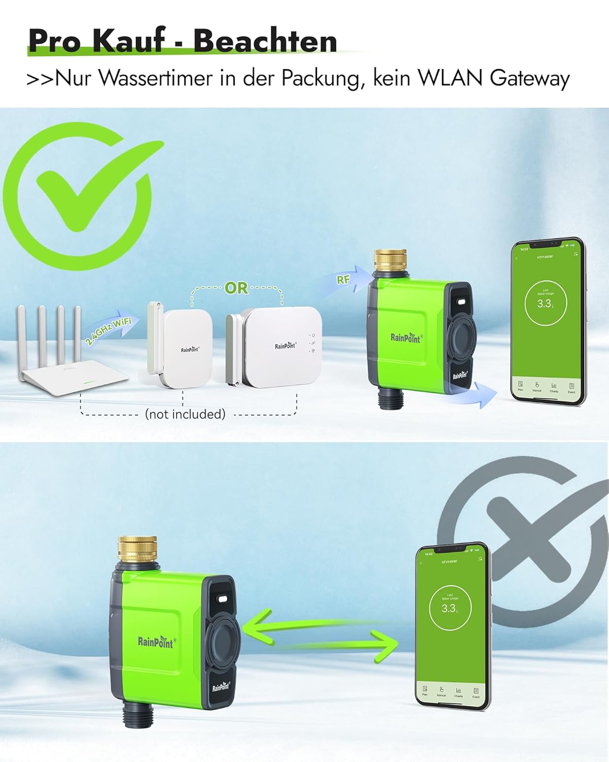 - WLAN-Konnektivität ohne Gateway: Enthält nur den Irrigation Computer; muss mit RAINPOINT HWG023 (2,4-GHz-WiFi) oder HWG040 (WiFi + Ethernet) gekoppelt werden für volle Funktionalität.