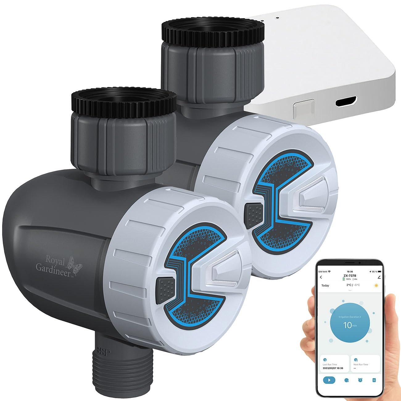 Die Konstruktion des Royal Gardineer Irrigation Control basiert auf hochwertigem Plastik, das speziell für den Außeneinsatz entwickelt wurde und eine Gewicht von 235 Gramm pro Einheit ermöglicht – leicht, aber stabil. Jede Komponente, vom Bewässerungscomputer bis zum WLAN-Gateway, ist mit Präzision gefertigt, um jahrelange Nutzung zu gewährleisten. Die Maße von 5,9 x 5,9 x 1,5 cm für das Gateway sorgen für eine kompakte Form, die unauffällig am Wasserhahn platziert werden kann, ohne den Gartenblick zu stören.