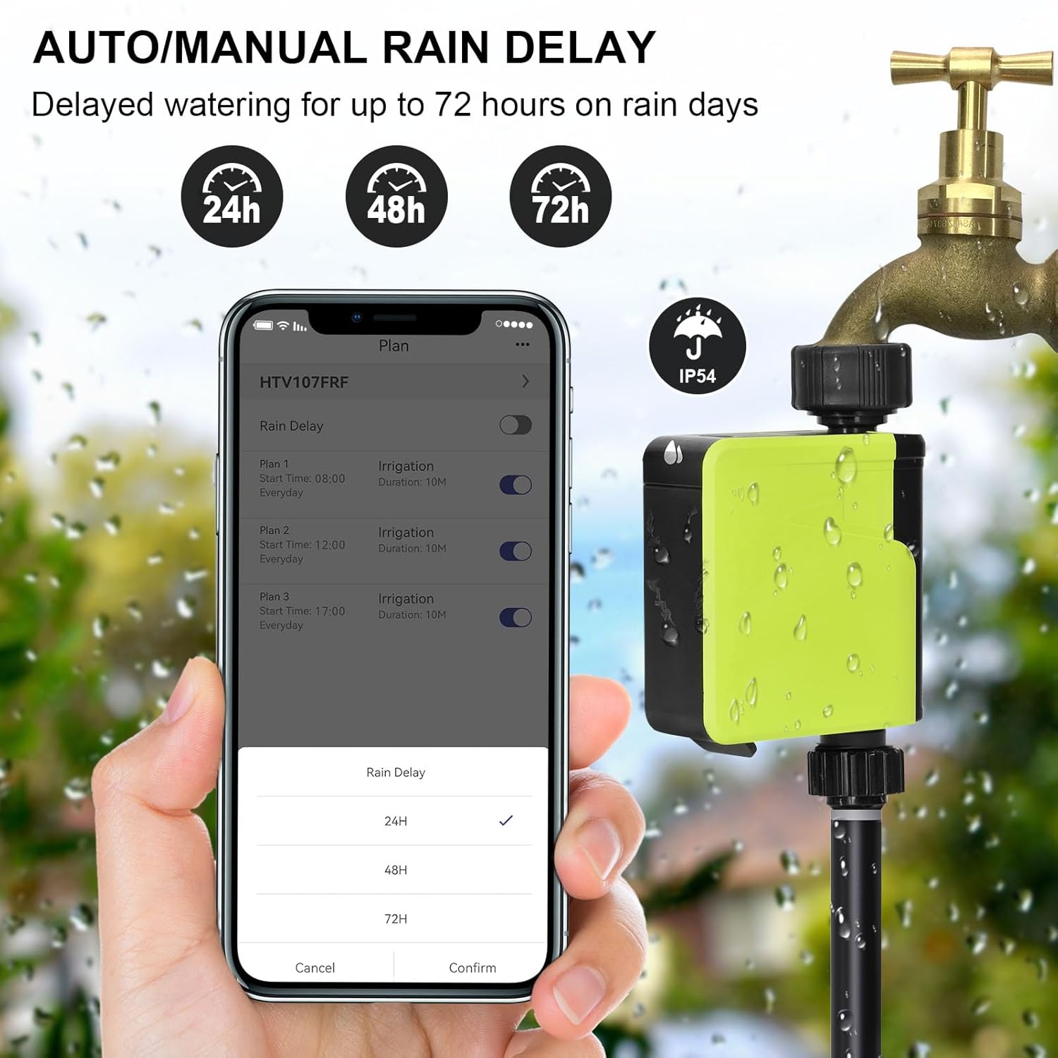 - Wetteradaptive Verzögerung: Automatische Pausen bei Regen für 24, 48 oder 72 Stunden, um Überwässerung zu vermeiden.