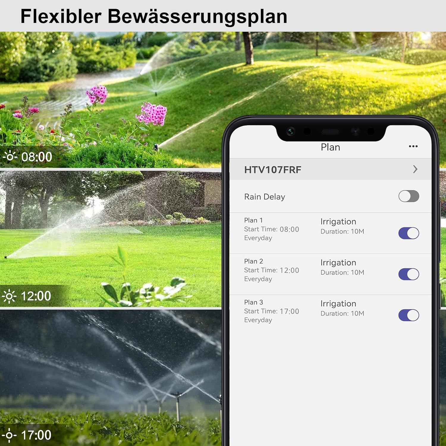 - Drei unabhängige Bewässerungspläne: Individuelle Einstellungen für Startzeit, Dauer und Wochentage (Montag bis Sonntag).